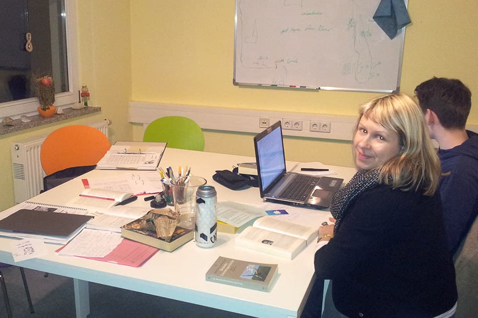 • Unser Highlight: Bei schönem Wetter nutzen die Dozenten mit den Schülern auch gern die große Terrasse – „Lernen unter freiem Himmel“